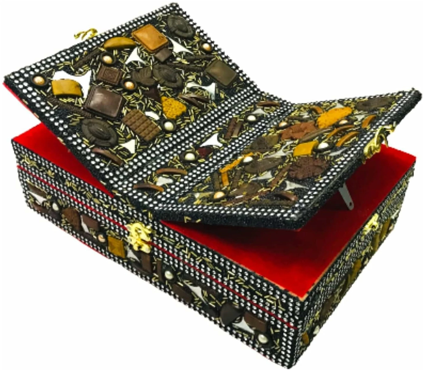 ♥ Dimensions : (H x l x P) (10,2 x 33 x 22,9 cm). Matériau : bois. Couleur : noir. Doublure en velours. Couleur : perles Travail : perles
