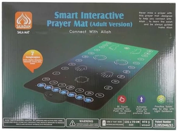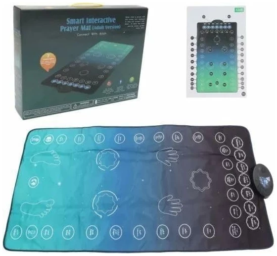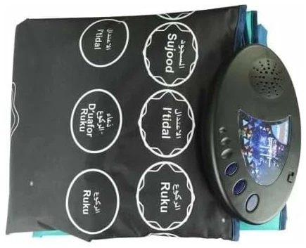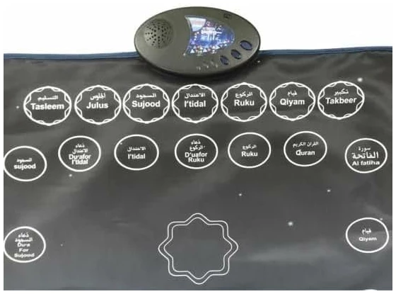 Tapis de prière intéractif éducatif 36 touches tactiles 7 langues : Francais, Arabe, Urdu, Malaisien, Turc ,Indonésien, Malaysien. Apprendre Le WUDU, L’ADHAN, les heures et positions de la salat, le sourates et les dou’as. Matériaux imperméables et résistants au feu. Système d’arrêt automatique, volume ajustable et pliable.