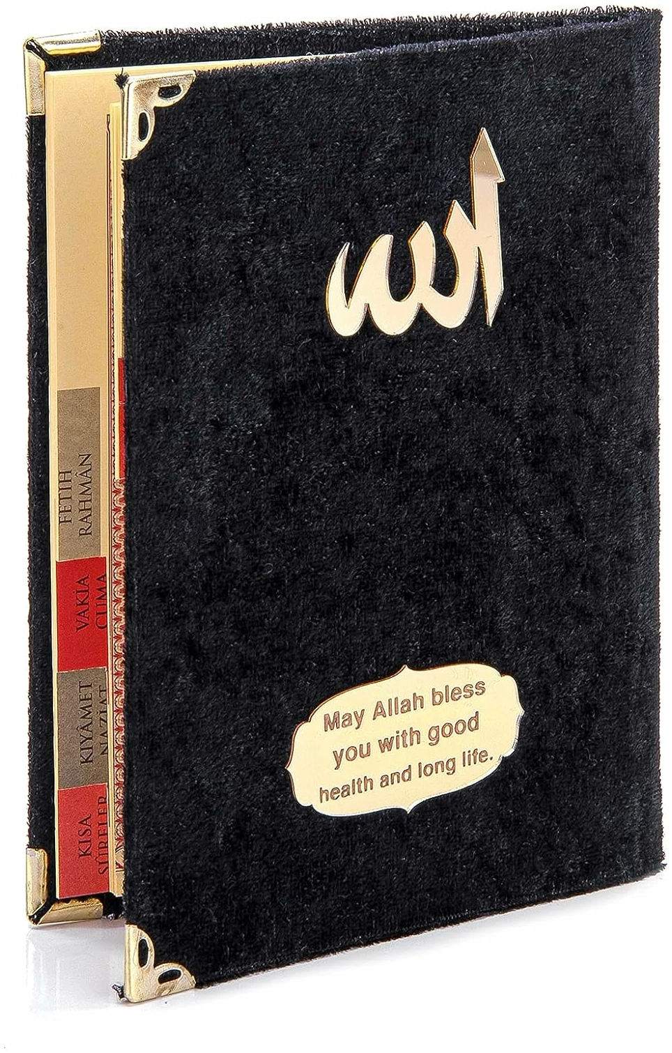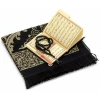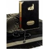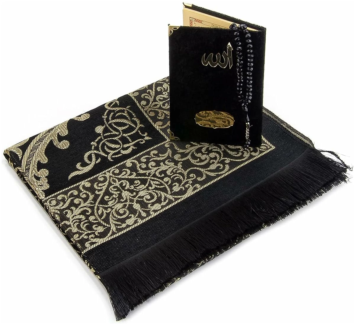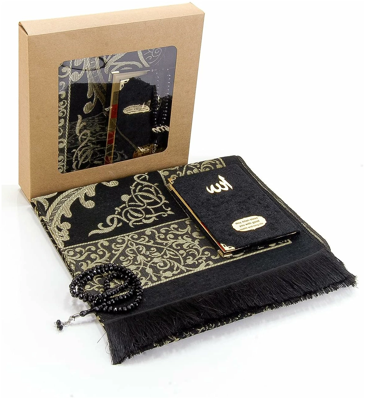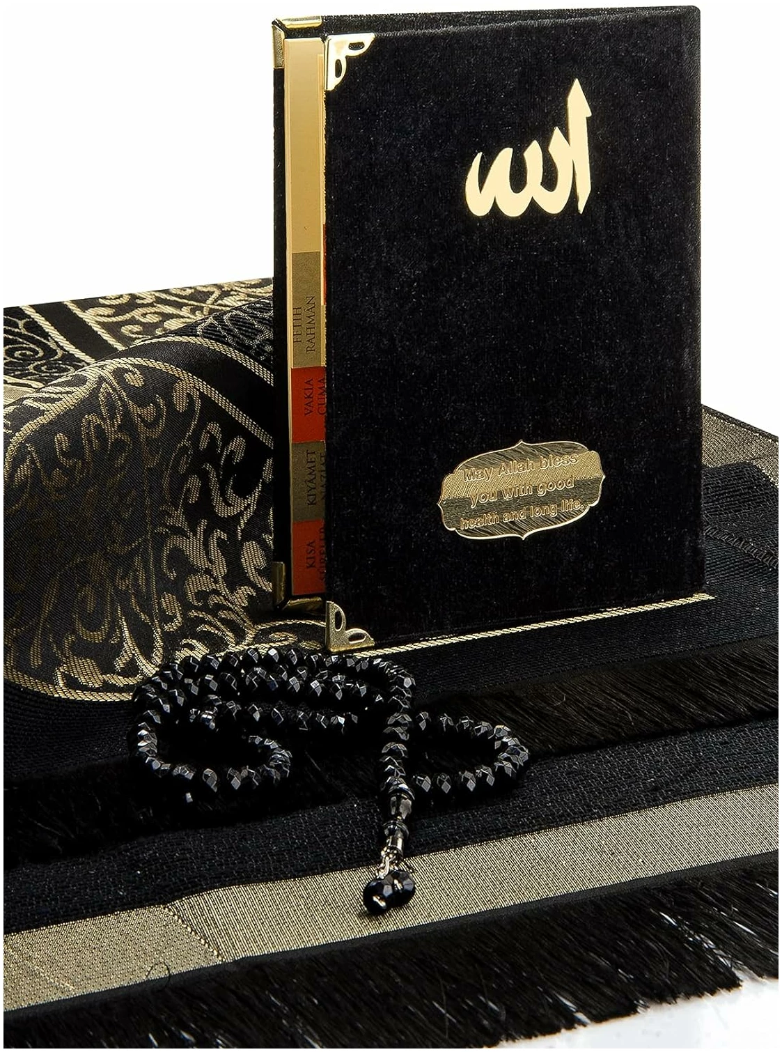 Tapis de prière musulman en taffetas et couverture de velours Yaseen sourate avec livre et perles de prière en cristal avec boîte en kraft, cadeau islamique parfait pour le Ramadan et l’Aïd, noir