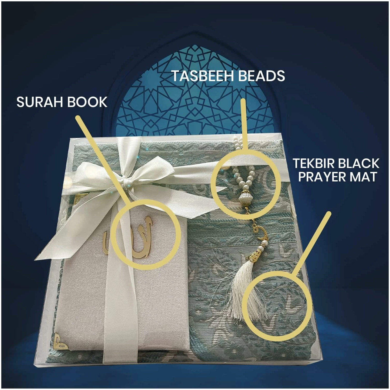 Design de qualité : ce coffret cadeau islamique de qualité supérieure avec un tapis de prière islamique en peluche, 99 perles de prière tasbih et un livre de 65 sourates du Coran