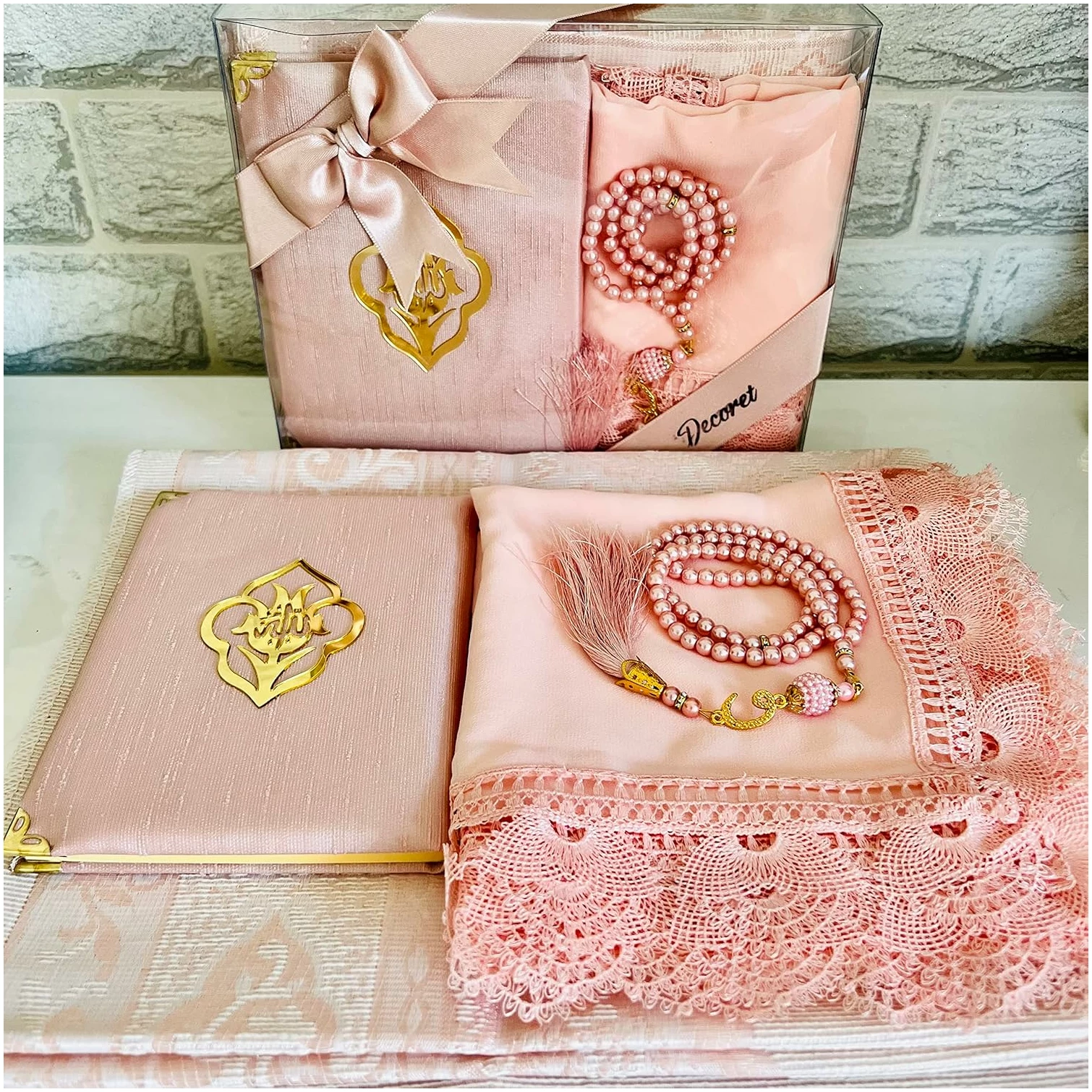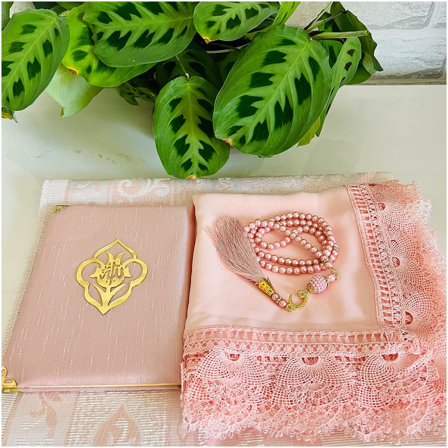 4 pièces ; 1 tapis de prière, 1 livre de poche Yaseen Sourate, 1 châle fantaisie, 1 perle de prière (99)